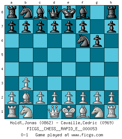 Last move : 0-1 2011 May 24 18:46:24 [Event "FICGS__CHESS__RAPID_E__000053"] [Site "FICGS"] [Date "2011.04.20"] [Round "1"] [White "Holdt,Jonas"] [Black "Cavaille,Cedric"] [Result "0-1"] [WhiteElo "0862"] [BlackElo "0969"] 1.b3 g6 2.Bb2 Nf6 0-1 This chess game has been lost on time (started : 2011.04.20 22:23:37) Nimzovich-Larsen attack Player Black won this chess game. Follow this game move after move (download)A chess genius has died; a loss for humanity. (Viktor Kortchnoi, about Bobby Fischer's death) Ich moechte nie einem Club beitreten, der Leute wie mich als Mitglieder aufnimmt. (Woody Allen) Cuando veas una buena jugada, trata de encontrar otra mejor. (Emanuel Lasker) Karpov est une pièce de musée. (Garry Kasparov) Those who make the worst use of their time are the first to complain of its brevity. (Jean de la Bruyere)