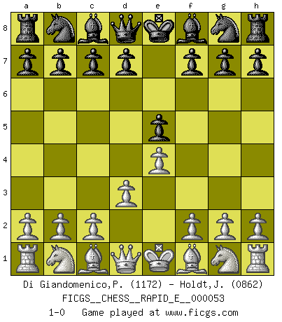 Last move : 1-0 2011 May 24 18:46:24 [Event "FICGS__CHESS__RAPID_E__000053"] [Site "FICGS"] [Date "2011.04.20"] [Round "1"] [White "Di Giandomenico,Pierino"] [Black "Holdt,Jonas"] [Result "1-0"] [WhiteElo "1172"] [BlackElo "0862"] 1.e4 e5 2.d3 1-0 This chess game has been lost on time (started : 2011.04.20 22:23:37) Variation Indian Opening : Indian Opening Player White won this chess game. Follow this game move after move (download)The winner of the game is the player who makes the next-to-last mistake. (Savielly Tartakover) Das Schachspiel übertrifft alle anderen Spiele so weit wie der Chimborasso einen Misthaufen. (Arthur Schopenhauer) Con el tiempo, empecé a progresar en partidas decisivas. Tal vez porque me di cuenta de una simple verdad: no solo estaba yo nervioso sino también mi oponente. (Mikhail Tal) Les Echecs ont trois composantes : le temps, l'espace et le matériel en dernier. (Mikhail Tal) Remember : Your focus determines your reality. (Qui-Gon Jinn in Star Wars ep.1)