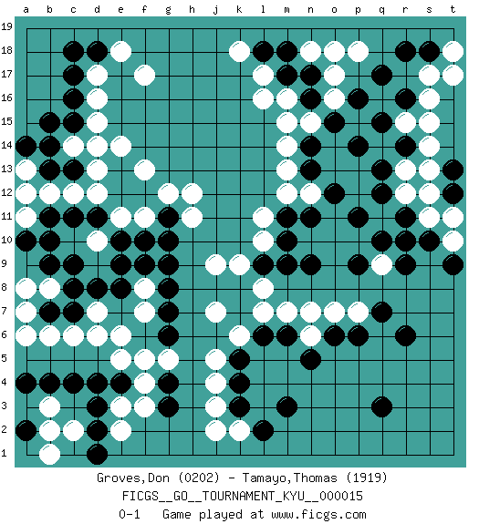 Last move : 0-1 2007 February 22 2:16:8 [Event "FICGS__GO__TOURNAMENT_KYU__000015"] [Site "FICGS"] [Date "2006.12.21"] [Round "1"] [Black "Groves,Don"] [White "Tamayo,Thomas"] [Result "0-1"] [Rating 1 "0202"] [Rating 2 "1919"] 1.q3 r15 2.d4 d17 3.r6 j3 4.k4 j4 5.k3 j5 6.k5 j7 7.c15 c12 8.c17 d16 9.c16 d15 10.c13 d12 11.c9 c6 12.g3 e6 13.c4 l16 14.q10 k6 15.l6 l7 16.m6 m7 17.q17 o17 18.p16 n6 19.n5 n7 20.o6 q9 21.p9 o7 22.p6 p7 23.q7 r12 24.r10 s17 25.p11 k2 26.l2 j2 27.m3 n15 28.p14 d13 29.b13 m12 30.n9 l10 31.n11 n12 32.o12 b12 33.d18 e18 34.c18 f17 35.e9 f11 36.b7 b6 37.c7 d7 38.d8 f7 39.b11 e3 40.e4 f3 41.d3 f4 42.g4 e5 43.g9 h11 44.m11 l11 45.g7 g5 46.g6 f5 47.c11 b3 48.b4 c2 49.d2 e2 50.d1 b1 51.a2 b2 52.r14 s14 53.r18 q14 54.q15 r13 55.q13 a6 56.a4 a13 57.a14 a12 58.b15 s11 59.s10 t10 60.t9 t11 61.r9 a11 62.b10 f8 63.f9 b8 64.c8 d10 65.d11 e11 66.e10 a7 67.g8 j9 68.e8 d6 69.b9 a8 70.g11 g12 71.d14 e14 72.g10 f13 73.n16 o16 74.n17 n18 75.m17 l17 76.m18 o18 77.l18 k18 78.r16 s16 79.r14 s15 80.r11 s13 81.f10 h12 82.a10 c14 83.b14 d14 84.n14 m15 85.s18 t18 86.t12 s12 87.t13 t17 88.o15 m14 89.n13 m13 90.q12 m16 91.l9 k9 92.m10 l8 93.m9 p18 0-1 Here are the names of the openings (joseki) played in the four corners : Corner d4 : d4 j3 Hoshi (Hwajeom, Seongjeom, Xingwei`) 4-4 Point. The star or hoshi (4-4) point, emphasizing influence at the potential expense of territory. Corner d16 : d17 c15 Komoku (Somok, Xiao~mu`) 3-4 Point. The komoku (3-4) point is the traditional corner enclosure move.. Ikken Kakari (Hankan Keolch'im, Yi Gua`jiao~, 1-Space Low Pincer). The small knight move is the basic approach move to the 3-4 point stone. It has been continually used for over four centuries. There are limitless variations, with new moves constantly being discovered. Black 2 opens the door to a treaure store of joseki. Player White won this Go (weiqi, baduk) game. Follow this game move after move (download)Don't overlook the edge of the board. (Anonymous) Perseverance does not equal worthiness. Next time you want to get my attention, wear something fun. Low-riding jeans are hot. (Gregory House, House M.D.)