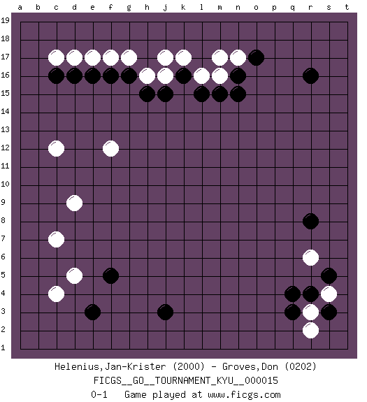 Last move : 0-1 2007 February 27 5:56:42 [Event "FICGS__GO__TOURNAMENT_KYU__000015"] [Site "FICGS"] [Date "2006.12.21"] [Round "1"] [Black "Helenius,Jan-Krister"] [White "Groves,Don"] [Result "0-1"] [Rating 1 "2000"] [Rating 2 "0202"] 1.r16 c4 2.q4 c17 3.e3 d5 4.j3 d9 5.o17 r6 6.r8 r3 7.r4 s4 8.q3 r2 9.s5 j17 10.d16 d17 11.e16 e17 12.f16 f17 13.g16 g17 14.c16 c12 15.j15 f12 16.f5 c7 17.s3 m17 18.k16 k17 19.n16 m16 20.m15 n17 21.n15 l16 22.l15 j16 23.h15 h16 0-1 This go game has been lost on time (started : 2006.12.21 5:16:51) Here are the names of the openings (joseki) played in the four corners : Corner d4 : c4 e3 Komoku (Somok, Xiao~mu`) 3-4 Point. The komoku (3-4) point is the traditional corner enclosure move.. Ikken Kakari (Hankan Keolch'im, Yi Gua`jiao~, 1-Space Low Pincer). The small knight move is the basic approach move to the 3-4 point stone. It has been continually used for over four centuries. There are limitless variations, with new moves constantly being discovered. Black 2 opens the door to a treaure store of joseki. Corner q4 : q4 r6 Hoshi (Hwajeom, Seongjeom, Xingwei`) 4-4 Point. The star or hoshi (4-4) point, emphasizing influence at the potential expense of territory. Ikken Kakari (Hankan Keolch'im, Yi Gua`jiao~, 1-Space Low Approach). White 2 is the standard approach move to the 4-4. Player White won this Go (weiqi, baduk) game. Follow this game move after move (download)Error is one of the sources of transformation. (Pierre Audouard) Any activity becomes creative when the doer cares about doing it right or doing it better. (John Updike)
