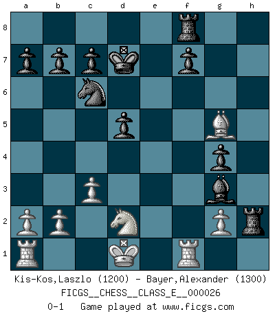 Last move : 0-1 2007 January 3 17:28:27 [Event "FICGS__CHESS__CLASS_E__000026"] [Site "FICGS"] [Date "2006.12.21"] [Round "1"] [White "Kis-Kos,Laszlo"] [Black "Bayer,Alexander"] [Result "0-1"] [WhiteElo "1200"] [BlackElo "1300"] 1.e4 Nc6 2.d4 e5 3.Nf3 exd4 4.Nxd4 Bc5 5.c3 Nf6 6.Nf5 Nxe4 7.Qg4 d5 8.Qxg7 Bxf2+ 9.Kd1 Qf6 10.Qxf6 Nxf6 11.Ng3 h5 12.Bg5 Ng4 13.h3 Bxg3 14.hxg4 Bxg4+ 15.Be2 Kd7 16.Bxg4+ hxg4 17.Rf1 Raf8 18.Nd2 Rh2 0-1 KP : Nimzovich defense Player Black won this chess game. Follow this game move after move (download)Only the player with the initiative has the right to attack. (Wilhelm Steinitz) Mit sehr nachdenklichem Gesicht schreitet Bobby durch den Turniersaal. Was ist passiert?, fragt Lombardy. Ich stehe schlecht, antwortet Fischer. Lombardy: Dann biete doch einfach Remis an. Fischer: So schlecht stehe ich nun auch wieder nicht! (Robert James Fischer) Con el tiempo, empecé a progresar en partidas decisivas. Tal vez porque me di cuenta de una simple verdad: no solo estaba yo nervioso sino también mi oponente. (Mikhail Tal) Les Echecs ont trois composantes : le temps, l'espace et le matériel en dernier. (Mikhail Tal) Remember : Your focus determines your reality. (Qui-Gon Jinn in Star Wars ep.1)