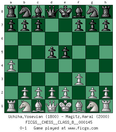 Last move : 0-1 2011 June 11 19:29:45 [Event "FICGS__CHESS__CLASS_B__000145"] [Site "FICGS"] [Date "2011.04.29"] [Round "1"] [White "Uchiha,Yosevian"] [Black "Magitz,Aaral"] [Result "0-1"] [WhiteElo "1800"] [BlackElo "2000"] 1.a4 e5 2.f3 d5 0-1 This chess game has been lost on time (started : 2011.04.29 15:31:35) Ware (Meadow Hay) Opening Player Black won this chess game. Follow this game move after move (download)Your body has to be in top condition. Your Chess deteriorates as your body does. You can't separate body from mind. (Bobby Fischer) Der Bart als Geschlechtszeichen mitten im Gesicht ist obszön. Daher gefällt er den Weibern. [Zugegeben, kein Schachzitat, aber unglaublich originell] (Arthur Schopenhauer) Cuando tu no sabes absolutamente que mas hacer, es tiempo de entrar en pánico. (John van der Wiel) On n'a jamais que l'âge auquel on a commence à jouer aux échecs car après on cesse de vieillir. (Capablanca) Train yourself to let go of everything you fear to lose. (Master Yoda in Star Wars ep.3)