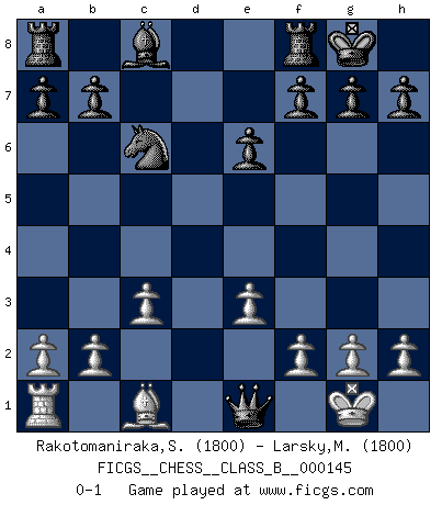 Last move : 0-1 2011 June 18 22:49:59 [Event "FICGS__CHESS__CLASS_B__000145"] [Site "FICGS"] [Date "2011.04.29"] [Round "1"] [White "Rakotomaniraka,Sandro"] [Black "Larsky,Mihail"] [Result "0-1"] [WhiteElo "1800"] [BlackElo "1800"] 1.e4 e6 2.Nf3 d5 3.Bb5+ c6 4.Bd3 dxe4 5.Bxe4 Nf6 6.Nc3 Nxe4 7.Nxe4 c5 8.O-O Nc6 9.Nxc5 Bxc5 10.c3 Qd3 11.Re1 O-O 12.Re3 Bxe3 13.dxe3 Qxd1+ 14.Ne1 Qxe1+ 0-1 French defense Kingside Castling by player White (move 8) Kingside Castling by player Black (move 11) Player Black won this chess game. Follow this game move after move (download)A strong memory, concentration, imagination, and a strong will is required to become a great Chess player. (Bobby Fischer) Frage: Gibt es etwas was Sie mehr lieben als Autobahnen ohne Tempobegrenzungen? - Antwort: Deutsche Frauen ohne Tempobegrenzungen. (Loek van Wely) Personalmente, yo prefiero mirar hacia el futuro en donde un programa de computadora gane el título mundial de Ajedrez. La humanidad necesita una lección de humildad. (Richard Dawkings) Plusieurs personnes se sont demandées comment Tal faisait pour gagner... En fait, c'est très simple ! Il met ses pièces au centre de l'échiquier et les sacrifie quelque part ! (David Bronstein) They say in chess you've got to kill the queen, and then you mate it... Oh I, do you ? (Red Hot Chili Peppers, Fortune faded)