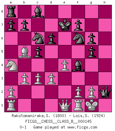 Last move : 0-1 2011 June 13 9:25:13 [Event "FICGS__CHESS__CLASS_B__000145"] [Site "FICGS"] [Date "2011.04.29"] [Round "1"] [White "Rakotomaniraka,Sandro"] [Black "Lois,Spyros"] [Result "0-1"] [WhiteElo "1800"] [BlackElo "1924"] 1.e4 c5 2.Nf3 Nc6 3.Bb5 g6 4.O-O Bg7 5.Nc3 e5 6.Nxe5 Bxe5 7.d3 Nf6 8.Bg5 d6 9.Na4 h6 10.c3 hxg5 11.b3 Bxh2+ 12.Kh1 Ke7 13.Qe1 Bf4 14.Kg1 Rh1+ 15.Kxh1 Qh8+ 16.Kg1 Qh2+ 0-1 Sicilian : Nimzovich-Rossolimo attack (with ...g6, without ...d6) Kingside Castling by player White (move 4) Player Black won this chess game. Follow this game move after move (download)Whoever sees no other aim in the game than that of giving checkmate to one's opponent will never become a good Chess player. (Euwe) Ich war schon mal beim Dopingtest. Da musste ich Urin abgeben, während Dritte zusahen. (Elisabeth Pähtz) Con o sin el título, Bobby Fischer fue sin lugar a dudas el mas grande jugador de su época. (Burt Hochberg) Le moment que je préfère le plus dans une rencontre, c'est celui où je sens que la personnalité de l'adversaire se brise. (Robert Fischer) Dave, my mind is going. I can feel it. (HAL 9000 in 2001, a space odyssey)