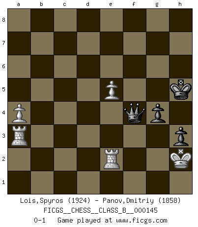 Last move : 0-1 2011 December 28 14:14:30 [Event "FICGS__CHESS__CLASS_B__000145"] [Site "FICGS"] [Date "2011.04.29"] [Round "1"] [White "Lois,Spyros"] [Black "Panov,Dmitriy"] [Result "0-1"] [WhiteElo "1924"] [BlackElo "1858"] 1.e4 e5 2.Nf3 Nc6 3.Bb5 a6 4.Ba4 Nf6 5.O-O Be7 6.Re1 b5 7.Bb3 d6 8.c3 O-O 9.h3 Na5 10.Bc2 c5 11.d4 Qc7 12.Nbd2 cxd4 13.cxd4 Nc6 14.a3 Bd7 15.Nb3 a5 16.Be3 a4 17.Nbd2 Rfe8 18.Bd3 Qb7 19.Qe2 Rab8 20.Rac1 exd4 21.Nxd4 Ne5 22.Bb1 Bd8 23.N4f3 Bc6 24.Nxe5 dxe5 25.b4 axb3 26.Nxb3 Qa8 27.Bc5 Be7 28.Qf3 Bxc5 29.Nxc5 h6 30.Rc3 Qa7 31.Bd3 Red8 32.Rec1 Rd6 33.h4 Rbd8 34.Qf5 Qe7 35.Qf3 Rd4 36.Qe2 Qd6 37.h5 Qb8 38.Nb3 R4d6 39.Nc5 Qa7 40.Qf3 Rd4 41.Qe2 Qa8 42.Nb3 R4d6 43.Nc5 Qa5 44.Rb3 Kh8 45.f4 Re8 46.Qb2 Nxh5 47.fxe5 Rg6 48.Bxb5 Bxb5 49.Rxb5 Qd8 50.Rb1 Nf4 51.Rb8 Rxg2+ 52.Qxg2 Qd4+ 53.Kh1 Nxg2 54.Rxe8+ Kh7 55.e6 Qxc5 56.exf7 Qh5+ 57.Kxg2 Qxf7 58.Reb8 Qg6+ 59.Kf3 h5 60.a4 h4 61.R8b5 Qg3+ 62.Ke2 Qf4 63.Kd3 Qf3+ 64.Kd4 h3 65.Ra1 Qf6+ 66.e5 Qd8+ 67.Ke4 Qa8+ 68.Kf4 Kh6 69.Ra2 Qd8 70.R5b2 g5+ 71.Kg3 Qd3+ 72.Kg4 Qd7+ 73.Kg3 Kh5 74.Kh2 g4 75.Ra3 Qd4 76.Re2 Qf4+ 0-1 Ruy Lopez : Closed Kingside Castling by player White (move 5) Kingside Castling by player Black (move 8) 10 pieces endgame at move 57 : White KRRPPP , Black KQPP WHITE : King + 2 Rooks 3 Pawns BLACK : King + 1 Queen 2 Pawns 9 pieces endgame at move 57 : White KRRPP , Black KQPP WHITE : King + 2 Rooks 2 Pawns BLACK : King + 1 Queen 2 Pawns Player Black won this chess game. Follow this game move after move (download)The mistakes are there, waiting to be made. (Savielly Tartakower) Nicht daß Diemer aus Opportunismus Mitglied der NSDAP geworden wäre. Er war ein Fanatiker, in allem, was er tat. (Hans Ree) En la vida, como en el Ajedrez, los Peones propios obstruyen nuestro camino. La gran fortuna de un hombre, su comodidad, placer, hijos, libros, que deberían ayudarle a ganar, con mucha frecuencia lo ponen en Jaque Mate. (Charles Buxton) Les échecs, c'est la lutte contre l'erreur. (Johannes Zukertort) Life is painting a picture, not doing a sum. (Oliver Wendell Holmes, Jr.)