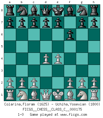 Last move : 1-0 2011 June 15 19:46:18 [Event "FICGS__CHESS__CLASS_C__000175"] [Site "FICGS"] [Date "2011.04.29"] [Round "1"] [White "Colarina,Floram"] [Black "Uchiha,Yosevian"] [Result "1-0"] [WhiteElo "1625"] [BlackElo "1800"] 1.e4 f6 2.d4 1-0 This chess game has been lost on time (started : 2011.04.29 17:11:47) Barnes defense Player White won this chess game. Follow this game move after move (download)Chess is above all, a fight ! (Emanuel Lasker) Obwohl ich alt bin, darf mir niemand den Finger in den Mund stecken, sonst beisse ich. (Wilhelm Steinitz) Debemos de asegurarnos de que el Ajedrez no se convierta en un lenguaje muerto, muy interesante, pero solo para un grupo muy pequeño. (Sytze Faber) Toutes choses étant égales, c'est la conviction qui gagne. Alliée à une volonté de vaincre, elle sert de détonateur, suscite des idées, disperse les doutes et aide à penser clairement. (Robert Fischer) The Internet is the world's largest library. It's just that all the books are on the floor. (John Allen Paulos)