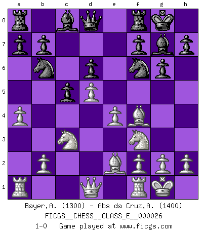 Last move : 1-0 2007 April 28 19:4:45 [Event "FICGS__CHESS__CLASS_E__000026"] [Site "FICGS"] [Date "2006.12.21"] [Round "1"] [White "Bayer,Alexander"] [Black "Abs da Cruz,Andre"] [Result "1-0"] [WhiteElo "1300"] [BlackElo "1400"] 1.d4 Nf6 2.c4 g6 3.Nc3 Bg7 4.e4 O-O 5.Nf3 d6 6.Be2 c5 7.d5 e6 8.O-O exd5 9.cxd5 Nbd7 10.Bf4 Nb6 11.a4 1-0 This chess game has been lost on time (started : 2006.12.21 23:6:49) King's Indian : 4.e4 Kingside Castling by player Black (move 4) Kingside Castling by player White (move 8) Player White won this chess game. Follow this game move after move (download)The only thing Chess players have in common is Chess. (Lodewijk Prins) Der Schachmeister von Heute braucht Courage, einen Killerinstinkt, Ausdauer und Arroganz. (Larry Evans) De todos mis libros Rusos, la defensa contiene y difunde el 'calor' mas grande que pudiese verse extraño al observar lo supremamente abstracto que el Ajedrez supuestamente es. (Vladimir Nabokov) Les Echecs ne sont pas pour les âmes timides. Ils requièrent un homme entier, qui ne s'arrête pas aveuglément à ce qui a été déjà établi, mais qui tente individuellement de sonder les profondeurs du jeu. (W. Steinitz) I couldn't make any sense out of what this particular thread is about. It sounds like R2 D2 computer speaking. A space fight ?!? Some 'command' problems in Moscow ? Some killers & narcotic addicts attacking some game & a god wannabe ?? (Dinesh De Silva, lost in a russian conflict in FICGS forum)