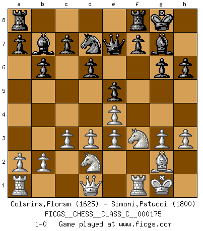 Last move : 1-0 2011 September 14 22:21:2 [Event "FICGS__CHESS__CLASS_C__000175"] [Site "FICGS"] [Date "2011.04.29"] [Round "1"] [White "Colarina,Floram"] [Black "Simoni,Patucci"] [Result "1-0"] [WhiteElo "1625"] [BlackElo "1800"] 1.Nf3 b6 2.g3 Bb7 3.Bg2 Nf6 4.d3 g6 5.O-O Bg7 6.c3 O-O 7.e4 d6 8.Re1 e5 9.Bg5 Nbd7 10.Nbd2 h6 11.Be3 Ng4 12.h3 Nxe3 13.fxe3 Qe7 14.Rf1 1-0 This chess game has been lost on time (started : 2011.04.29 17:11:47) Reti Opening Kingside Castling by player White (move 5) Kingside Castling by player Black (move 6) Player White won this chess game. Follow this game move after move (download)I have never in my life played the French Defence, which is the dullest of all openings. (Wilhelm Steinitz) Das typische an einem Großmeister ist, daß er eine gewonnene Position schnell und schmerzlos gewinnt. (Irving Chernev) Nunca nadie ha ganado una partida de Ajedrez rindiendose. (Unknown) J'ai vu le vaincu d'Echecs jouer des années durant dans l'espoir de la fête de la victoire. Car tu es plus riche de ce qu'elle existe si même elle n'est point pour toi. Ainsi de la perle du fond des mers. (Antoine de Saint-Exupéry) The real danger is not that computers will begin to think like men, but that men will begin to think like computers. (Sydney J. Harris)
