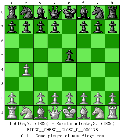 Last move : 0-1 2011 June 9 7:22:55 [Event "FICGS__CHESS__CLASS_C__000175"] [Site "FICGS"] [Date "2011.04.29"] [Round "1"] [White "Uchiha,Yosevian"] [Black "Rakotomaniraka,Sandro"] [Result "0-1"] [WhiteElo "1800"] [BlackElo "1800"] 1.b4 e5 0-1 This chess game has been lost on time (started : 2011.04.29 17:11:47) Polish (Sokolsky) opening Player Black won this chess game. Follow this game move after move (download)Bobby is the finest Chess player this country ever produced. His memory for the moves, his brilliance in dreaming up combinations, and his fierce determination to win are uncanny. (John Collins) Nur ein wirklich starker Spieler weiß wie schwach er spielt. (Savielly Grigorievitsch Tartakower) Los Peones son el alma de una partida de Ajedrez. (Francois Andre Danican Philidor) Plusieurs personnes se sont demandées comment Tal faisait pour gagner... En fait, c'est très simple ! Il met ses pièces au centre de l'échiquier et les sacrifie quelque part ! (David Bronstein) The existence of forgetting has never been proved: We only know that some things don't come to mind when we want them. (Friedrich Nietzsche)