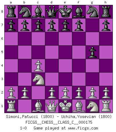 Last move : 1-0 2011 June 13 7:47:1 [Event "FICGS__CHESS__CLASS_C__000175"] [Site "FICGS"] [Date "2011.04.29"] [Round "1"] [White "Simoni,Patucci"] [Black "Uchiha,Yosevian"] [Result "1-0"] [WhiteElo "1800"] [BlackElo "1800"] 1.c4 g5 2.Nc3 1-0 This chess game has been lost on time (started : 2011.04.29 17:11:47) English Opening Player White won this chess game. Follow this game move after move (download)In the perfect Chess combination as in a first-rate short story, the whole plot and counter-plot should lead up to a striking finale, the interest not being allayed until the very last moment. (Yates and Winter) Ich verstehe den Grund nicht, warum die Aufteilung in Frauen und Männer überhaupt im Schach besteht. (Judith Polgar) Bobby es la celebridad menos entendida y malinterpretada que camina el la faz de esta tierra. (Yasser Seirawan) Si je n'étais pas joueur d'échecs, je serais le meilleur dans quelque chose d'autre. (Anatoli Karpov) I'm extremely disappointed. I send you out for exciting, new designer drugs, you come back with tomato sauce. (Gregory House, House M.D.)