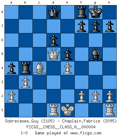 Last move : 1-0 2006 September 19 1:51:35 [Event "FICGS__CHESS__CLASS_A__000004"] [Site "FICGS"] [Date "2006.05.04"] [Round "1"] [White "Sobrecases,Guy"] [Black "Chaplain,Fabrice"] [Result "1-0"] [WhiteElo "2105"] [BlackElo "2095"] 1.e4 c5 2.Nf3 Nc6 3.d4 cxd4 4.Nxd4 Nf6 5.Nc3 e5 6.Ndb5 d6 7.Bg5 a6 8.Na3 b5 9.Nd5 Be7 10.Bxf6 Bxf6 11.c3 Ne7 12.Nc2 Nxd5 13.Qxd5 Rb8 14.Nb4 Bb7 15.Qd3 O-O 16.Rd1 Bg5 17.Be2 a5 18.Nd5 Bxd5 19.Qxd5 b4 20.cxb4 Rxb4 21.b3 a4 22.Bc4 1-0 Sicilian : Pelikan (Lasker/Sveshnikov) variation Kingside Castling by player Black (move 15) Player White won this chess game. Follow this game move after move (download)I won't play with you anymore. You have insulted my friend. - When an opponent cursed himself for a blunder. (Miguel Najdorf) Ich bin es gewohnt, das die Jugend mir überhaupt keinen Respekt entgegenbringt. (Alexander Morozewich) No nos podemos resistir a la fascinación de un sacrificio ya que la pasión por los sacrificios es parte de la naturaleza de un jugador de Ajedrez. (Rudolf Spielman) Aux échecs, l'amour-propre est satisfait quand on remporte la victoire, mais il n'y a pas de honte à être battu. (Benjamin Franklin) You think that education is too expensive ? Try ignorance. (Derek Bok)
