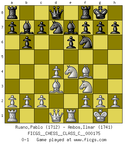 Last move : 0-1 2011 June 20 7:59:21 [Event "FICGS__CHESS__CLASS_C__000175"] [Site "FICGS"] [Date "2011.04.29"] [Round "1"] [White "Ruano,Pablo"] [Black "Ambos,Ilmar"] [Result "0-1"] [WhiteElo "1712"] [BlackElo "1741"] 1.e4 e6 2.d4 d5 3.Nc3 dxe4 4.Nxe4 Nd7 5.Nf3 Ngf6 6.Bd3 Be7 7.O-O O-O 8.Re1 b6 9.Bf4 Bb7 0-1 This chess game has been lost on time (started : 2011.04.29 17:11:47) French : Rubinstein variation Kingside Castling by player White (move 7) Kingside Castling by player Black (move 7) Player Black won this chess game. Follow this game move after move (download)Many have become Chess Masters, no one has become the Master of Chess. (Siegbert Tarrasch) Die Idee von Capablanca, Schach als Fach in den Schulen zu lehren, ist großartig. (Fidel Castro) Yo creo que el Ajedrez posee una magia que es también una ayuda en la edad avanzada. Una rodilla reumática es olvidada durante una partida de Ajedrez y otros eventos pueden parecer algo sin importancia comparada a una catástrofe en el tablero de Ajedrez. (Vlastimil Hort) Ce qui est bien, c'est d'avoir tout un tas de pièces en prise : l'adversaire ne peut en prendre qu'une à la fois. Cité par Thierry Audin. I have opinions of my own - strong opinions - but I don't always agree with them. (George Bush)