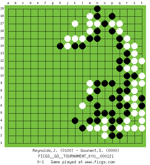 Last move : 0-1 2011 July 25 8:45:45 [Event "FICGS__GO__TOURNAMENT_KYU__000121"] [Site "FICGS"] [Date "2011.04.29"] [Round "1"] [Black "Reynolds,James"] [White "Gounant,Stanislas"] [Result "0-1"] [Rating 1 "0100"] [Rating 2 "0000"] 1.q4 s6 2.r6 s7 3.r8 r7 4.q7 s8 5.r9 s9 6.s10 t9 7.t6 t5 8.t7 s5 9.s4 t10 10.t11 r4 11.q6 s3 12.r5 r3 13.q2 t4 14.k4 q3 15.p3 s11 16.r10 r11 17.q11 o4 18.p4 o3 19.o5 o6 20.p5 p6 21.n6 o7 22.n8 n7 23.m7 o8 24.n5 n3 25.o9 p8 26.p9 m8 27.n9 m9 28.q8 t12 29.r12 s13 30.r13 s12 31.n4 m3 32.m4 l6 33.p7 t3 34.l3 o2 35.p2 r14 36.q14 r15 37.q12 s14 38.q15 q16 39.p16 q17 40.p18 p17 41.o17 n17 42.n16 m17 43.n18 m18 44.n19 m16 45.n15 k17 46.m15 l15 47.l14 k15 48.k14 j14 49.h14 j15 0-1 This go game has been lost on time (started : 2011.04.29 17:40:29) Here are the names of the openings (joseki) played in the four corners : Corner q4 : q4 s6 Hoshi (Hwajeom, Seongjeom, Xingwei`) 4-4 Point. The star or hoshi (4-4) point, emphasizing influence at the potential expense of territory. Corner q16 : t11 s11 This joseki is unknown. A weak or weird move has probably been played in this corner. Corner d16 : j14 h14 This joseki is unknown. A weak or weird move has probably been played in this corner. Player White won this Go (weiqi, baduk) game. Follow this game move after move (download)To emphasize the lack of determination in his moves, one speaks of chance. (Pierre Audouard) Convictions are more dangerous enemies of truth than lies. (Friedrich Nietzsche)