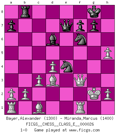 Last move : 1-0 2007 April 6 22:15:30 [Event "FICGS__CHESS__CLASS_E__000026"] [Site "FICGS"] [Date "2006.12.21"] [Round "1"] [White "Bayer,Alexander"] [Black "Miranda,Marcus"] [Result "1-0"] [WhiteElo "1300"] [BlackElo "1400"] 1.e4 e5 2.f4 exf4 3.Nf3 Be7 4.Bc4 Bh4+ 5.Kf1 d5 6.exd5 Bg4 7.d4 Qf6 8.Qd3 Bxf3 9.Qxf3 Qe7 10.Be2 c6 11.Nc3 Qb4 12.Qxf4 Be7 13.dxc6 bxc6 14.Nb5 cxb5 15.Qe4 Nf6 16.Qxa8 O-O 17.c3 Qa5 18.Qb7 Nbd7 19.Qxb5 Qc7 20.g3 Rb8 21.Qd3 h6 22.Kg2 h5 23.Qc4 Qd8 24.Rf1 h4 25.gxh4 Bd6 26.h5 Qe7 27.Qd3 Ne4 28.Qf3 Ndf6 29.Bd3 1-0 KGA : Cunningham defense Kingside Castling by player Black (move 16) Player White won this chess game. Follow this game move after move (download)Only sissies Castle. (Rob Sillars) Über Kasparov: Es ist offensichtlich, daß er in einem totalitären Staat aufwuchs und deshalb zu diktatorischen Zügen neigt. (Viktor Kortschnoi) El Ajedrez es tan interesante por sí solo, que no es necesario un interés monetario para persuadir a una persona a que lo practique; por lo tanto, nunca se juega por dinero. (Benjamin Franklin) Des combinaisons [dans le jeu d'échecs] pareilles à des mélodies. Je crois entendre pour ainsi dire la musique des coups... (Vladimir Nabokov) Industry executives and analysts often mistakenly talk about strategy as if it were some kind of chess match. But in chess, you have just two opponents, each with identical resources, and with luck playing a minimal role. The real world is much more like a poker game, with multiple players trying to make the best of whatever hand fortune has dealt them. In our industry, Bill Gates owns the table until someone proves otherwise. (David Moschella, 'Computerworld')