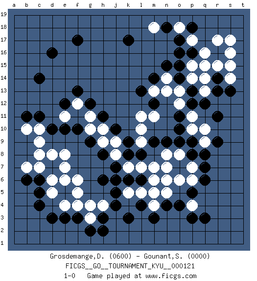 Last move : 1-0 2011 May 13 0:29:31 [Event "FICGS__GO__TOURNAMENT_KYU__000121"] [Site "FICGS"] [Date "2011.04.29"] [Round "1"] [Black "Grosdemange,David"] [White "Gounant,Stanislas"] [Result "1-0"] [Rating 1 "0600"] [Rating 2 "0000"] 1.d16 r17 2.q3 d5 3.d3 e4 4.e3 f4 5.q8 p6 6.q6 o6 7.p5 n6 8.r13 n5 9.o4 p7 10.q7 q9 11.p8 o8 12.p9 q10 13.p13 p10 14.o9 n8 15.o10 p11 16.o11 o12 17.p12 o13 18.o14 n14 19.n15 p14 20.o15 p15 21.m14 n13 22.m12 m13 23.l13 q13 24.q12 q14 25.r11 s14 26.r9 s15 27.c4 n7 28.c5 d6 29.c6 c7 30.f3 g3 31.n4 m4 32.r14 r15 33.p16 q15 34.o17 q16 35.m3 p4 36.p3 g4 37.l4 m5 38.k3 e6 39.g2 d8 40.h3 h4 41.j4 k5 42.j5 f5 43.k6 l5 44.h6 k7 45.l6 l7 46.j7 m7 47.k8 m6 48.j6 m11 49.m9 l11 50.n9 l9 51.l8 j8 52.k9 l10 53.h8 j9 54.j10 h9 55.g9 h10 56.h11 g10 57.f10 g11 58.g12 f6 59.h2 e8 60.s13 c8 61.c11 s16 62.c14 e7 63.f17 s17 64.k17 c9 65.d10 b10 66.b11 c10 67.e10 b7 68.b6 e11 69.e12 f12 70.f13 p17 71.o16 o18 72.n18 m18 73.p18 1-0 Here are the names of the openings (joseki) played in the four corners : Corner d4 : d5 d3 Takamoku (Gomok, Gaomu`) 5-4 Point. The takamoku (high) point (5-4). With its emphasis on influence, the 5-4 point complements the 4-4 (hoshi) point in creating an influence-oriented fuseki. Komoku. White responds with 3-3, 3-5, 4-6, 4-7, 3-6, 3-7. Corner q16 : r17 r13 San-San (Sam-Sam, San-San) 3-3 Point. The San-San (3-3) point, emphasizing territory at the expense of influence. Player Black won this Go (weiqi, baduk) game. Follow this game move after move (download)Beware of the clumsy double contact. (Anonymous) If computers get too powerful, we can organize them into committees. That'll do them in. (Anonymous)