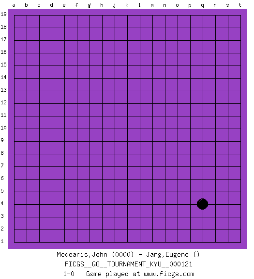 Last move : 1-0 2011 May 30 6:59:30 [Event "FICGS__GO__TOURNAMENT_KYU__000121"] [Site "FICGS"] [Date "2011.04.29"] [Round "1"] [Black "Medearis,John"] [White "Jang,Eugene"] [Result "1-0"] [Rating 1 "0000"] 1.q4 1-0 This go game has been lost on time (started : 2011.04.29 17:40:29) Here are the names of the openings (joseki) played in the four corners : Corner q4 : q4 1-0 Hoshi (Hwajeom, Seongjeom, Xingwei`) 4-4 Point. The star or hoshi (4-4) point, emphasizing influence at the potential expense of territory. Player Black won this Go (weiqi, baduk) game. Follow this game move after move (download)The rectangular six is normally alive. (Anonymous) The smarter you play, the luckier you'll be. (Mark Pilarski)