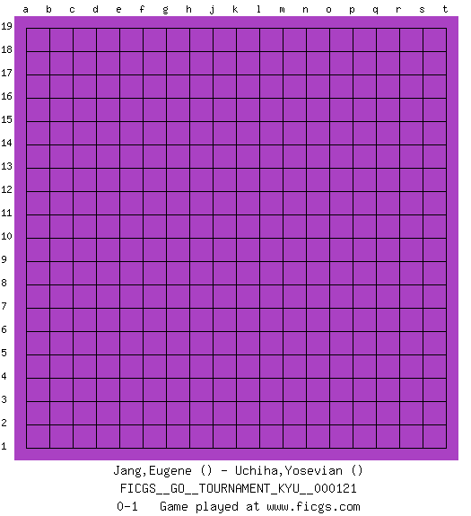 Last move : 0-1 2011 May 29 19:0:17 [Event "FICGS__GO__TOURNAMENT_KYU__000121"] [Site "FICGS"] [Date "2011.04.29"] [Round "1"] [Black "Jang,Eugene"] [White "Uchiha,Yosevian"] [Result "0-1"] 0-1 This go game has been lost on time (started : 2011.04.29 17:40:29) Here are the names of the openings (joseki) played in the four corners : Player White won this Go (weiqi, baduk) game. Follow this game move after move (download)To emphasize the lack of determination in his moves, one speaks of chance. (Pierre Audouard) Everybody lies. (Gregory House, House M.D.)
