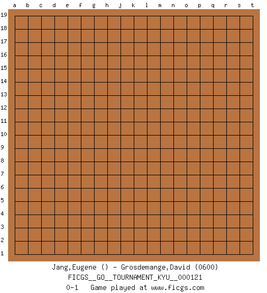 Last move : 0-1 2011 May 29 19:0:17 [Event "FICGS__GO__TOURNAMENT_KYU__000121"] [Site "FICGS"] [Date "2011.04.29"] [Round "1"] [Black "Jang,Eugene"] [White "Grosdemange,David"] [Result "0-1"] [Rating 2 "0600"] 0-1 This go game has been lost on time (started : 2011.04.29 17:40:29) Here are the names of the openings (joseki) played in the four corners : Player White won this Go (weiqi, baduk) game. Follow this game move after move (download)The L-group is dead. (Anonymous) No, no, you're not thinking; you're just being logical. (Niels Bohr)