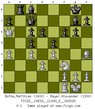 Last move : 0-1 2007 January 7 14:8:22 [Event "FICGS__CHESS__CLASS_E__000026"] [Site "FICGS"] [Date "2006.12.21"] [Round "1"] [White "Bothe,Matthias"] [Black "Bayer,Alexander"] [Result "0-1"] [WhiteElo "1400"] [BlackElo "1300"] 1.e4 c5 2.Nc3 Nc6 3.Nf3 d6 4.Bc4 g6 5.d3 Bg7 6.O-O Nf6 7.Bf4 O-O 8.Nd5 Nxd5 9.Bxd5 Bxb2 10.Rb1 Bg7 11.Bxc6 bxc6 12.c4 e5 13.Bg5 f6 14.Bh4 Be6 15.Qa4 Qc7 16.Qa6 Rfb8 17.Rxb8+ Rxb8 18.a4 Bc8 0-1 Sicilian : Closed, 2...Nc6 Kingside Castling by player White (move 6) Kingside Castling by player Black (move 7) Player Black won this chess game. Follow this game move after move (download)Robert Fischer is a law unto himself. (Larry Evans) Ein bischen Romantik kann weder im Schach noch in der Liebe schaden. Also versuche ich mich ab und zu daran zu erinnern. (Nigel Short) El Ajedrez era la lengua materna de Capablanca. (Reti) Shah mat. Le roi est mort. Cri de fierté d'un joueur venant de terrasser son adversaire, courtoisement, sans effusion de sang. Beep ! (R2D2 in Star Wars ep.3)