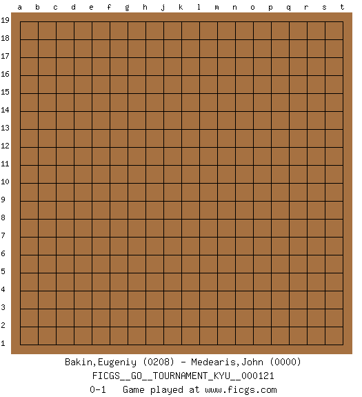 Last move : 0-1 2011 May 29 19:0:17 [Event "FICGS__GO__TOURNAMENT_KYU__000121"] [Site "FICGS"] [Date "2011.04.29"] [Round "1"] [Black "Bakin,Eugeniy"] [White "Medearis,John"] [Result "0-1"] [Rating 1 "0208"] [Rating 2 "0000"] 0-1 This go game has been lost on time (started : 2011.04.29 17:40:29) Here are the names of the openings (joseki) played in the four corners : Player White won this Go (weiqi, baduk) game. Follow this game move after move (download)Studying go is a wonderful way to develop both the creative as well as the logical abilities of children because to play it both sides of the brain are necessary. (Cho Chikun) Memory is a way of holding onto the things you love, the things you are, the things you never want to lose. (from the television show: The Wonder Years)