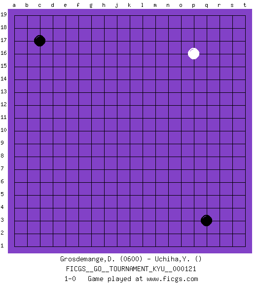 Last move : 1-0 2011 June 1 7:7:3 [Event "FICGS__GO__TOURNAMENT_KYU__000121"] [Site "FICGS"] [Date "2011.04.29"] [Round "1"] [Black "Grosdemange,David"] [White "Uchiha,Yosevian"] [Result "1-0"] [Rating 1 "0600"] 1.c17 p16 2.q3 1-0 This go game has been lost on time (started : 2011.04.29 17:40:29) Here are the names of the openings (joseki) played in the four corners : Corner q4 : q3 1-0 Komoku (Somok, Xiao~mu`) 3-4 Point. The komoku (3-4) point is the traditional corner enclosure move.. Player Black won this Go (weiqi, baduk) game. Follow this game move after move (download)Answer the keima with a kosumi. (Anonymous) Perseverance does not equal worthiness. Next time you want to get my attention, wear something fun. Low-riding jeans are hot. (Gregory House, House M.D.)