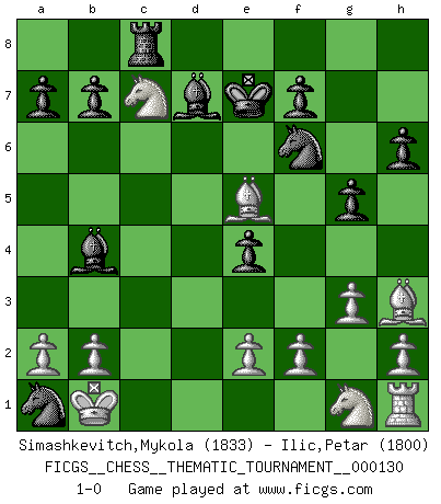 Last move : 1-0 2011 August 28 22:3:52 [Event "FICGS__CHESS__THEMATIC_TOURNAMENT__000130"] [Site "FICGS"] [Date "2011.04.30"] [Round "1"] [White "Simashkevitch,Mykola"] [Black "Ilic,Petar"] [Result "1-0"] [WhiteElo "1833"] [BlackElo "1800"] 1.c4 e5 2.g3 c6 3.d4 e4 4.Nc3 d5 5.cxd5 cxd5 6.Qb3 Nc6 7.Qxd5 Qxd5 8.Nxd5 Nxd4 9.Bg5 Nc2+ 10.Kd2 Nxa1 11.Nc7+ Kd7 12.Nxa8 h6 13.Bf4 Bb4+ 14.Kc1 Nf6 15.Bg2 Ke7 16.Nc7 Bd7 17.Kb1 Rc8 18.Bh3 g5 19.Be5 1-0 This chess game has been lost on time (started : 2011.04.30 13:46:54) English Opening Player White won this chess game. Follow this game move after move (download)Chess is a part of culture and if a culture is declining then Chess too will decline. (Mikhail Botvinnik) Der Partner hat auch seine Existenzberechtigung. (Savielly Grigorievitsch Tartakower) Mi estilo es algo parecido entre un poco de Tal y Petrosian. (Reshevsky) Le jeu d'échecs fait naître et fortifie en nous plusieurs qualités précieuses dans le cours de l'existence, telles que la prévoyance, la circonspection, la prudence, et la persévérance. (Benjamin Franklin - 1783, la morale des échecs) Perhaps the current trend of many chess professionals taking up the more lucrative pastime of poker is not a wholly negative one. It may not be too late for humans to relearn how to take risks in order to innovate and thereby maintain the advanced lifestyles we enjoy. And if it takes a poker-playing supercomputer to remind us that we can't enjoy the rewards without taking the risks, so be it. (The Chess Master and the Computer, by Garry Kasparov - 2010)
