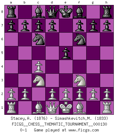 Last move : 0-1 2011 June 11 7:26:1 [Event "FICGS__CHESS__THEMATIC_TOURNAMENT__000130"] [Site "FICGS"] [Date "2011.04.30"] [Round "1"] [White "Stacey,Alan"] [Black "Simashkevitch,Mykola"] [Result "0-1"] [WhiteElo "1876"] [BlackElo "1833"] 1.c4 e5 2.Nf3 Nc6 3.Nc3 Nf6 0-1 This chess game has been lost on time (started : 2011.04.30 13:46:54) English, Nimzovich variation Player Black won this chess game. Follow this game move after move (download)Avoid the crowd. Do your own thinking independently. Be the Chess player, not the Chess piece. (Ralph Charell) Kein Großmeister ist normal. Sie unterscheiden sich nur im Ausmaß Ihrer Verrücktheit. (Viktor Kortschnoi) No volvere nunca a jugar contigo. Has insultado a mi amigo. - cuando un oponente se maldijo por una mala jugada (Miguel Najdorf) Les écrivains ont utilisé les échecs pour analyser les côtés extrêmes de la nature humaine. Dans ce cadre, les échecs offrent un champ d'expérimentation idéal. Mais on pourrait faire la même chose avec la peinture. Et là, en vous référant à Van Gogh, vous ne tirerez pas de conclusion définitive sur les peintres. (Gary Kasparov) I believe in luck. How else can you explain the success of those you dislike ? (Jean Cocteau)