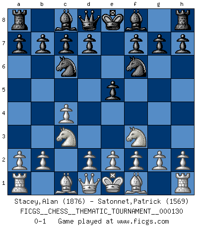 Last move : 0-1 2011 June 28 20:3:58 [Event "FICGS__CHESS__THEMATIC_TOURNAMENT__000130"] [Site "FICGS"] [Date "2011.04.30"] [Round "1"] [White "Stacey,Alan"] [Black "Satonnet,Patrick"] [Result "0-1"] [WhiteElo "1876"] [BlackElo "1569"] 1.c4 e5 2.Nc3 Nf6 3.Nf3 Nc6 0-1 This chess game has been lost on time (started : 2011.04.30 13:46:54) English Opening Player Black won this chess game. Follow this game move after move (download)A good sacrifice is one that is not necessarily sound but leaves your opponent dazed and confused. (Rudolph Spielmann) Jeder Fehler erscheint unglaublich dumm, wenn andre ihn begehen. (Georg Christoph Lichtenberg) El Ajedrez es el arte del análisis. (Mikhail Botvinnik) Pour se monter efficace, un Cavalier a besoin d'avant-postes ! Les Cavaliers font les meilleurs bloqueurs de pions passés. The large trees attract high winds. (Chinese proverb)