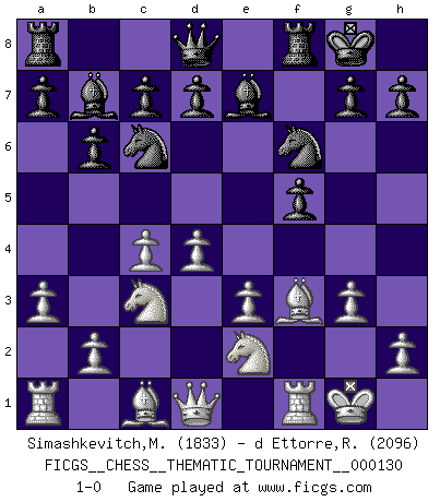 Last move : 1-0 2011 June 11 15:7:41 [Event "FICGS__CHESS__THEMATIC_TOURNAMENT__000130"] [Site "FICGS"] [Date "2011.04.30"] [Round "1"] [White "Simashkevitch,Mykola"] [Black "d Ettorre,Rodolfo"] [Result "1-0"] [WhiteElo "1833"] [BlackElo "2096"] 1.c4 e5 2.g3 f5 3.Bg2 Nf6 4.Nc3 Nc6 5.e3 Be7 6.d4 O-O 7.Nge2 e4 8.O-O b6 9.f3 exf3 10.Bxf3 Bb7 11.a3 1-0 English Opening Kingside Castling by player Black (move 6) Kingside Castling by player White (move 8) Player White won this chess game. Follow this game move after move (download)Nowadays, when you're not a grandmaster at 14, you can forget about it. (Anand Viswanathan) Ich verlor meine Bürgerrechte, mein Gehalt wurde mir nicht mehr bezahlt und ich wurde zensiert und durfte nicht mehr ins Ausland reisen. [nach dem Match Fischer-Taimanov 6:0] (Mark Taimanov) Cualquier cambio de material en una posición debe venir por medio de un mate, una captura o promoción de Peón. (Purdy) Celui qui prend des risques peut perdre, celui qui n'en prend pas perd toujours. (Xavier Tartacover) It's not a bug - it's an undocumented feature. (Anonymous)