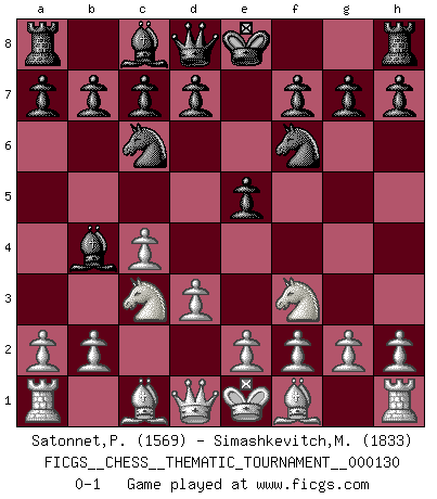 Last move : 0-1 2011 June 11 19:29:45 [Event "FICGS__CHESS__THEMATIC_TOURNAMENT__000130"] [Site "FICGS"] [Date "2011.04.30"] [Round "1"] [White "Satonnet,Patrick"] [Black "Simashkevitch,Mykola"] [Result "0-1"] [WhiteElo "1569"] [BlackElo "1833"] 1.c4 e5 2.Nc3 Nf6 3.Nf3 Nc6 4.d3 Bb4 0-1 This chess game has been lost on time (started : 2011.04.30 13:46:54) English Opening Player Black won this chess game. Follow this game move after move (download)It's just you and your opponent at the board and you're trying to prove something. (Bobby Fischer) Im Leben werden Partien nie so unstrittig gewonnen wie im Spiel (Emanuel Lasker) A través de las casillas del tablero, los Indios explican el movimiento del tiempo y la edad, las influencias mas altas que controlan el mundo y los lazos que vinculan al Ajedrez con el alma humana. (Al-Masudi) L'ordinateur a tué l'originalité. Il n'y a plus guère d'aventures sur l'échiquier. (Jacob Murray) Nothing is more important for teaching us to understand the concepts we have than constructing fictitious ones. (Ludwig Wittgenstein)