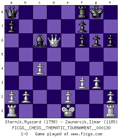 Last move : 1-0 2011 July 28 8:42:17 [Event "FICGS__CHESS__THEMATIC_TOURNAMENT__000130"] [Site "FICGS"] [Date "2011.04.30"] [Round "1"] [White "Sternik,Ryszard"] [Black "Zaunercik,Ilmar"] [Result "1-0"] [WhiteElo "1798"] [BlackElo "1185"] 1.c4 c5 2.Nf3 Nc6 3.Nc3 Nf6 4.g3 d6 5.Bg2 g6 6.d4 cxd4 7.Nxd4 Bg7 8.Nxc6 bxc6 9.Bxc6+ Bd7 10.Bxa8 Qxa8 11.f3 O-O 12.Bg5 h6 13.Bxf6 Bxf6 14.Nd5 Bc6 15.Nxf6+ exf6 16.Qxd6 1-0 This chess game has been lost on time (started : 2011.04.30 13:46:54) English : Symmetrical variation Kingside Castling by player Black (move 11) Player White won this chess game. Follow this game move after move (download)The battle for the ultimate truth will never be won. And that's why Chess is so fascinating. (Hans Kmoch) Um dein Spiel zu verbessern musst du zuallererst das Endspiel studieren, denn diese kann unabhängig studiert werden. Die Eröffnung und das Mittelspiel müssen immer in Bezug gesetzt werden zum Endspiel. (José Raúl Capablanca) Fischer es el jugador mas fuerte del mundo. De hecho, el jugador mas fuerte que jamas haya existido. (Larry Evans) Fischer est le meilleur joueur du monde et Karpov n'est qu'un joueur de bistrot. (Garry Kasparov, agé de 16 ans) For a mechanic, you seem to do an excessive amount of thinking. (C-3PO in Star Wars ep.2)
