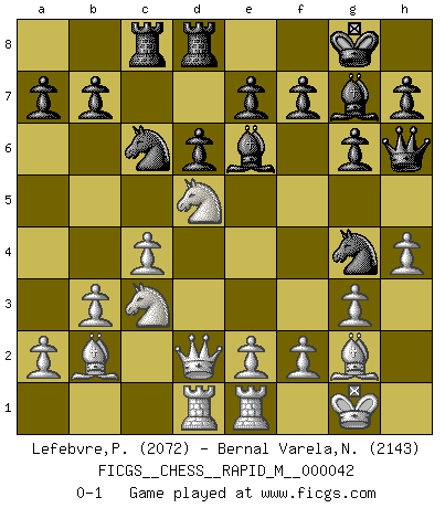 Last move : 0-1 2011 August 21 9:59:46 [Event "FICGS__CHESS__RAPID_M__000042"] [Site "FICGS"] [Date "2011.05.01"] [Round "1"] [White "Lefebvre,Pierre"] [Black "Bernal Varela,Nelson"] [Result "0-1"] [WhiteElo "2072"] [BlackElo "2143"] 1.Nf3 Nf6 2.g3 g6 3.Bg2 Bg7 4.c4 O-O 5.O-O c5 6.Nc3 Nc6 7.d4 cxd4 8.Nxd4 Qb6 9.Nc2 d6 10.b3 Qc5 11.Bb2 Qh5 12.h4 Rd8 13.Qc1 Bg4 14.Re1 Bh6 15.Qd1 Bg7 16.Ne3 Be6 17.Qd2 Ng4 18.Ned5 Rac8 19.Rad1 Qh6 0-1 This chess game has been lost on time (started : 2011.05.01 2:12:38) Reti : King's Indian attack Kingside Castling by player Black (move 4) Kingside Castling by player White (move 5) Player Black won this chess game. Follow this game move after move (download)It is peculiar but a fact nevertheless, that gamblers in chess always have enthusiastic followers. (Botvinnik) Ich verstehe den Grund nicht, warum die Aufteilung in Frauen und Männer überhaupt im Schach besteht. (Judith Polgar) Por esta medida (el intervalo entre Fischer y sus contemporaneos), yo le considero el mas grande campeón mundial. (Garry Kasparov) Les ravages du H expliquent la différence de niveau entre Tal et Thal [Abergel]. The problem with manipulation is that people can turn on you. (Horatio Caine, C.S.I. Miami)