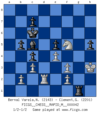 Last move : 1/2-1/2 2011 July 14 3:50:12 [Event "FICGS__CHESS__RAPID_M__000042"] [Site "FICGS"] [Date "2011.05.01"] [Round "1"] [White "Bernal Varela,Nelson"] [Black "Clement,George"] [Result "1/2-1/2"] [WhiteElo "2143"] [BlackElo "2201"] 1.e4 e5 2.Nf3 Nc6 3.Bb5 a6 4.Bxc6 dxc6 5.O-O f6 6.d4 Bg4 7.c3 c5 8.dxe5 Qxd1 9.Rxd1 fxe5 10.Na3 b5 11.Nc2 Bd6 12.a4 Rb8 13.Bg5 h6 14.Bh4 Ne7 15.Ne3 Bxf3 16.gxf3 g5 17.Bg3 Kf7 18.axb5 axb5 19.h4 gxh4 20.Bxh4 Ng6 21.Nf5 Ke6 22.Ra6 Nxh4 23.Nxh4 Ra8 24.Rda1 Rxa6 25.Rxa6 Rg8+ 26.Kh2 c4 27.Nf5 h5 28.Ra5 Rb8 29.Kg2 Kd7 30.Ra1 Rg8+ 31.Kh3 Bc5 32.Rd1+ Kc6 33.Rd2 Rg1 1/2-1/2 Ruy Lopez : Exchange, Gligoric variation Kingside Castling by player White (move 5) This chess game ended in a draw. Follow this game move after move (download)Chess demands total concentration. (Bobby Fischer) Ich kenne Menschen, die allen Willen der Welt besitzen und doch nicht Schach spielen können. (Robert James Fischer) Yo adoro todas la posiciones. Denme una partida posicional difícil, y la jugaré. Pero posiciones totalmente ganadas, no las tolero. (Hein Donner) Pour se monter efficace, un Cavalier a besoin d'avant-postes ! Les Cavaliers font les meilleurs bloqueurs de pions passés. It's unlucky to be superstitious. (Dave Enteles)
