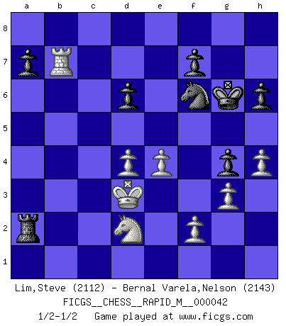 Last move : 1/2-1/2 2011 September 21 3:56:39 [Event "FICGS__CHESS__RAPID_M__000042"] [Site "FICGS"] [Date "2011.05.01"] [Round "1"] [White "Lim,Steve"] [Black "Bernal Varela,Nelson"] [Result "1/2-1/2"] [WhiteElo "2112"] [BlackElo "2143"] 1.d4 Nf6 2.c4 g6 3.Nc3 d5 4.Nf3 c6 5.cxd5 cxd5 6.Bf4 Bg7 7.e3 O-O 8.Bd3 Nh5 9.Be5 Bg4 10.Qb3 Nc6 11.Bxg7 Kxg7 12.Qxb7 Qd6 13.Qb3 Rab8 14.Qxd5 Nb4 15.Qxd6 Nxd3+ 16.Kd2 exd6 17.Kxd3 Rxb2 18.Nd2 Bf5+ 19.Ke2 Re8 20.g3 Nf6 21.Rhc1 Rb4 22.Kf3 g5 23.a3 Rb6 24.Ke2 Rc8 25.h4 g4 26.a4 Rbc6 27.Na2 Rc2 28.Rxc2 Rxc2 29.Kd1 Bg6 30.Nc1 Rb2 31.Ra2 Rb6 32.a5 Rc6 33.Ne2 h6 34.Ke1 Nd5 35.Rb2 Ra6 36.Rb5 Nc7 37.Rb7 Ne8 38.Nf4 Rxa5 39.e4 Nf6 40.Nxg6 Kxg6 41.Ke2 Ra2 42.Kd3 1/2-1/2 King's Indian defense, 3.Nc3 Kingside Castling by player Black (move 7) This chess game ended in a draw. Follow this game move after move (download)Botvinnik tried to take the mystery out of Chess, always relating it to situations in ordinary life. He used to call Chess a typical inexact problem similar to those which people are always having to solve in everyday life. (Garry Kasparov) Im Fernschach kannst du während dem Spiel rauchen. (John Christen Knudsen) Debemos de asegurarnos de que el Ajedrez no se convierta en un lenguaje muerto, muy interesante, pero tan solo para un grupo muy pequeño. (Sytze Faber) Assurément je connaissais par expérience le mystérieux attrait de ce jeu royal, le seul entre tous les jeux inventés par les hommes qui échappe souverainement à la tyrannie du hasard, le seul où l'on ne doive sa victoire qu'à son intelligence ou plutôt à une certaine forme d'intelligence. Mais n'est-ce pas déjà le limiter injurieusement que d'appeler les échecs un jeu ? N'est-ce pas une science, un art ou quelque chose qui, comme le cercueil de Mahomet entre ciel et terre, est suspendu entre l'un et l'autre, et qui réunit un nombre incroyable de contraires ? [...] C'est une pensée qui ne mène à rien, une mathématique qui n'établit rien, un art qui ne laisse pas d'uvre, une architecture sans matière; et il l'a prouvé néanmoins qu'il était plus durable, à sa manière, que les livres ou que tout autre monument, ce jeu unique qui appartient à tous les peuples et à tous les temps, et dont personne ne sait quel dieu en fit don à la terre pour tuer l'ennui, pour aiguiser l'esprit et stimuler l'âme. Où commence-t-il, où finit-il ? (Stefan Zweig) Looking at the proliferation of personal web pages on the Net, it looks like very soon everyone on Earth will have 15 megabytes of fame. (M.G. Sriram)
