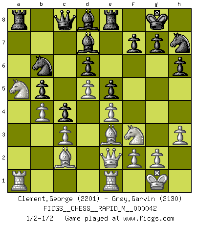 Last move : 1/2-1/2 2011 July 21 17:13:22 [Event "FICGS__CHESS__RAPID_M__000042"] [Site "FICGS"] [Date "2011.05.01"] [Round "1"] [White "Clement,George"] [Black "Gray,Garvin"] [Result "1/2-1/2"] [WhiteElo "2201"] [BlackElo "2130"] 1.e4 e5 2.Nf3 Nc6 3.Bb5 a6 4.Ba4 Nf6 5.O-O Be7 6.Re1 b5 7.Bb3 d6 8.c3 O-O 9.h3 Bb7 10.d4 Re8 11.Nbd2 Bf8 12.a3 h6 13.Bc2 Nb8 14.b4 Nbd7 15.Bb2 c5 16.d5 Qc7 17.Nb3 Nb6 18.Na5 Bc8 19.Bc1 Bd7 20.Be3 Rac8 21.Rc1 Be7 22.Nd2 Bd8 23.Qe2 c4 24.a4 Nh7 25.axb5 axb5 26.Nf3 Ra8 27.Ra1 Qc8 1/2-1/2 Ruy Lopez : Closed Kingside Castling by player White (move 5) Kingside Castling by player Black (move 8) This chess game ended in a draw. Follow this game move after move (download)Many have become Chess Masters, no one has become the Master of Chess. (Siegbert Tarrasch) Wie kann ich Remis annehmen? Ich weiß ja gar nicht, wie ich stehe! (Fritz Sämisch) Sin errores no puede haber brillantez. (Emanuel Lasker) Il vaut toujours mieux jouer un plan faux de façon logique que de n'avoir pas de plan du tout. (Victor Kortchnoï) There are two major products that came out of Berkeley: LSD and UNIX. We do not believe this is to be a coincidence. (Jeremy S. Anderson)