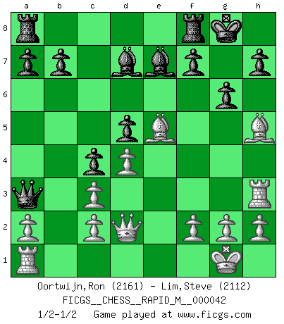 Last move : 1/2-1/2 2011 May 28 10:49:24 [Event "FICGS__CHESS__RAPID_M__000042"] [Site "FICGS"] [Date "2011.05.01"] [Round "1"] [White "Oortwijn,Ron"] [Black "Lim,Steve"] [Result "1/2-1/2"] [WhiteElo "2161"] [BlackElo "2112"] 1.d4 Nf6 2.Bf4 c5 3.e3 Nd5 4.Bg3 Qb6 5.Nc3 Nxc3 6.bxc3 d5 7.Nf3 Qa5 8.Qd2 c4 9.e4 e6 10.Be2 Be7 11.O-O O-O 12.Rfe1 Nc6 13.Ne5 Nxe5 14.Bxe5 Bd7 15.exd5 exd5 16.Bh5 Qa3 17.Re3 g6 18.Rh3 1/2-1/2 Queen's pawn game Kingside Castling by player White (move 11) Kingside Castling by player Black (move 11) This chess game ended in a draw. Follow this game move after move (download)Chess is 99 percent tactics. (Teichmann) Ich verlor meine Bürgerrechte, mein Gehalt wurde mir nicht mehr bezahlt und ich wurde zensiert und durfte nicht mehr ins Ausland reisen. [nach dem Match Fischer-Taimanov 6:0] (Mark Taimanov) Me gusta decir que Bobby Fischer fue el mejor jugador que jamás haya existido. Pero lo que hizo de Fischer un genio, fue su habilidad de mezclar una frescura y pragmatismo Americano con ideas Rusas acerca de la estrategia. (Bruce Pandolfini) Avec des compensations pour le matériel en plus... (Anonyme) All battles are fought by scared men who'd rather be someplace else. (John Wayne in the movie In harm's way)