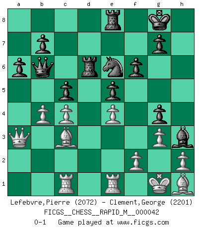 Last move : 0-1 2011 August 9 9:26:51 [Event "FICGS__CHESS__RAPID_M__000042"] [Site "FICGS"] [Date "2011.05.01"] [Round "1"] [White "Lefebvre,Pierre"] [Black "Clement,George"] [Result "0-1"] [WhiteElo "2072"] [BlackElo "2201"] 1.c4 e5 2.Nc3 Nc6 3.g3 Bc5 4.Nf3 d6 5.Bg2 Nf6 6.O-O O-O 7.d3 a6 8.a3 Nd4 9.Nh4 Ba7 10.e3 Ne6 11.Nf3 Re8 12.b4 c6 13.Bb2 h6 14.Qd2 Qe7 15.Rfd1 Ng5 16.Nxg5 hxg5 17.a4 Be6 18.a5 Qd7 19.Na4 Bh3 20.Bh1 Rad8 21.Rac1 Qe7 22.Re1 Qd7 23.Rc2 g4 24.Nb6 Bxb6 25.axb6 d5 26.Qc1 dxc4 27.dxc4 Nh7 28.e4 f6 29.Qa1 Ng5 30.Qa3 Ne6 31.R2c1 c5 32.Qa5 Qc6 33.Bc3 Rd6 34.Qa3 Qxb6 0-1 This chess game has been lost on time (started : 2011.05.01 2:12:38) English : Sicilian Reversed Kingside Castling by player White (move 6) Kingside Castling by player Black (move 6) Player Black won this chess game. Follow this game move after move (download)Not all artists are Chess players, but all Chess players are artists. (Marcel Duchamp) Das Spiel gibt uns die Genugtuung, die das Leben uns versagt. (Emanuel Lasker) De todos mis libros Rusos, la defensa contiene y difunde el 'calor' mas grande que pudiese verse extraño al observar lo supremamente abstracto que el Ajedrez supuestamente es. (Vladimir Nabokov) L'action d'une oeuvre littéraire se déroule sur un champ de bataille. Les masques et les types du drame moderne correspondent aux pièces du jeu d'échecs. L'intrigue correspond aux coups et aux gambits, c'est à dire aux techniques du jeu telles qu'utilisées et interprétées par les joueurs. Les tactiques et les péripéties [mouvements] correspondent aux coups exécutés par l'adversaire. (Viktor Shklovsky) Somewhere in the world there is an epigram for every dilemma. (Hendrik Willem van Loon)