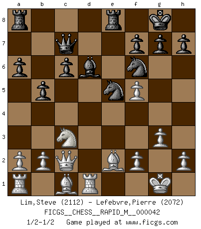 Last move : 1/2-1/2 2011 July 2 9:53:49 [Event "FICGS__CHESS__RAPID_M__000042"] [Site "FICGS"] [Date "2011.05.01"] [Round "1"] [White "Lim,Steve"] [Black "Lefebvre,Pierre"] [Result "1/2-1/2"] [WhiteElo "2112"] [BlackElo "2072"] 1.d4 Nf6 2.c4 e6 3.Nf3 d5 4.Nc3 c6 5.e3 Nbd7 6.Qc2 Bd6 7.Bd3 O-O 8.O-O dxc4 9.Bxc4 a6 10.Rd1 b5 11.Be2 Qc7 12.e4 e5 13.dxe5 Nxe5 14.Nd4 Rd8 15.Nf5 Bxf5 16.exf5 Re8 17.g3 1/2-1/2 Queen's pawn game Kingside Castling by player Black (move 7) Kingside Castling by player White (move 8) This chess game ended in a draw. Follow this game move after move (download)What would Chess be without silly mistakes ? (Kurt Richter) Die jungen Leute sollen verstehen, dass sie noch etwas von mir lernen können und müssen. (Viktor Kortschnoi) Mis oponentes también hacen buenas movidas. A veces yo no tomo esas cosas en consideración. (Bobby Fischer) Le jeu d'échecs est comme rejeté hors du temps. (Antoine de Saint-Exupéry) Now the reason the enlightened prince and the wise general conquer the enemy whenever they move and their achievements surpass those of ordinary men is foreknowledge. (Sun Tzu)