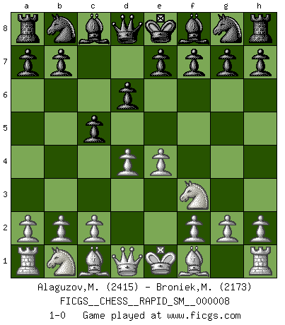 Last move : 1-0 2011 June 20 19:58:37 [Event "FICGS__CHESS__RAPID_SM__000008"] [Site "FICGS"] [Date "2011.05.01"] [Round "1"] [White "Alaguzov,Maxat"] [Black "Broniek,Mariusz Maciej"] [Result "1-0"] [WhiteElo "2415"] [BlackElo "2173"] 1.e4 c5 2.Nf3 d6 3.d4 1-0 This chess game has been lost on time (started : 2011.05.01 10:55:35) Sicilian Player White won this chess game. Follow this game move after move (download)If your opponent cannot do anything active, then don't rush the position; instead you should let him sit there, suffer, and beg you for a draw. (Jeremy Silman) Er war ein guter Schachspieler, aber ich kann Leute nicht ausstehen, die 'Heil Hitler' rufen (Über Alexander Aljechin). (Miguel Najdorf) El Ajedrez es 99 por ciento táctica. (Teichmann) La guerre est enfant de la passion, la passion est enfant du narcissisme et le narcissisme est l'enfant. (...) Une autre partie ? (Thibault de Vassal) A good player is always lucky. (Capablanca)