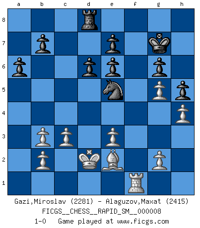 Last move : 1-0 2011 July 28 20:42:51 [Event "FICGS__CHESS__RAPID_SM__000008"] [Site "FICGS"] [Date "2011.05.01"] [Round "1"] [White "Gazi,Miroslav"] [Black "Alaguzov,Maxat"] [Result "1-0"] [WhiteElo "2281"] [BlackElo "2415"] 1.d4 Nf6 2.Bg5 Ne4 3.Bf4 c5 4.Nd2 Nxd2 5.Qxd2 cxd4 6.O-O-O d6 7.Qxd4 Nc6 8.Qa4 g6 9.Be5 Bh6+ 10.e3 O-O 11.Bc3 Bg7 12.Bxg7 Kxg7 13.h4 h5 14.Ne2 a6 15.Nf4 Bd7 16.Qb3 Qa5 17.Be2 Rac8 18.Rd5 Qb4 19.c3 Qxb3 20.axb3 Be6 21.Nxe6+ fxe6 22.Rg5 Rf5 23.f4 Rxg5 24.fxg5 Ne5 25.Rf1 Rd8 26.Kd2 1-0 This chess game has been lost on time (started : 2011.05.01 10:55:35) Trompowsky attack (Ruth, Opovcensky Opening) Queenside Castling by player White (move 6) Kingside Castling by player Black (move 10) Player White won this chess game. Follow this game move after move (download)A sacrifice is best refuted by accepting it. (Wilhelm Steinitz) Die Arbeit ist etwas Unnatürliches. Die Faulheit allein ist göttlich. (Anatole France) Cada Peón es una Reina en potencia. (James Mason) Il vaut toujours mieux jouer un plan faux de façon logique que de n'avoir pas de plan du tout. (Victor Kortchnoï) When you stop learning you start dying. (M. Scott Adams)