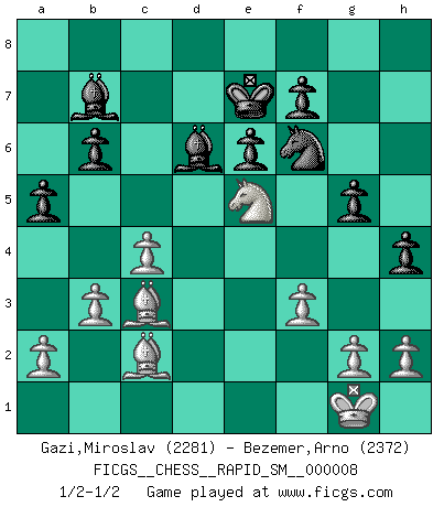 Last move : 1/2-1/2 2011 June 30 21:10:59 [Event "FICGS__CHESS__RAPID_SM__000008"] [Site "FICGS"] [Date "2011.05.01"] [Round "1"] [White "Gazi,Miroslav"] [Black "Bezemer,Arno"] [Result "1/2-1/2"] [WhiteElo "2281"] [BlackElo "2372"] 1.d4 d5 2.c4 e6 3.Nc3 c6 4.e3 Nf6 5.Nf3 Nbd7 6.Qc2 b6 7.Bd3 Bb7 8.O-O Be7 9.b3 O-O 10.Bb2 h6 11.Rac1 Rc8 12.Qe2 Bd6 13.e4 dxe4 14.Nxe4 Nxe4 15.Bxe4 Nf6 16.Bc2 c5 17.Rcd1 Qe7 18.dxc5 Bxc5 19.Ne5 Rfd8 20.Kh1 h5 21.Bc3 a5 22.Rfe1 h4 23.Kg1 Rxd1 24.Rxd1 Rd8 25.Rd2 Rxd2 26.Bxd2 Qd6 27.Bc3 Kf8 28.Qd3 Qxd3 29.Nxd3 Bd6 30.Ne5 Ke7 31.f3 g5 1/2-1/2 QGD : Semi-Slav Kingside Castling by player White (move 8) Kingside Castling by player Black (move 9) This chess game ended in a draw. Follow this game move after move (download)Chess is like life. (Boris Spassky) Es tut gut, die Entwicklungsperiode von, [...] demokratischem Geist durchdringen zu lassen. Wie undemokratisch wäre es doch beispielsweise, den einen Offizier große Spaziertouren vornehmen zu lassen, während die anderen zu Hause säßen und sich entsetzlich langweilten. (Aaron Nimzowitsch) La vida es como el Ajedrez, con lucha, competición y eventos buenos y malos. (Benjamin Franklin) On entre au jeu d'Echecs comme on entre en Religion. Pour le joueur d'Echecs, la partie d'Echecs c'est l'office, la messe, le défilé du 1er Mai, le dépôt de gerbe au Monument aux Morts. C'est un drame sacré. (Michel Roos) To err is human, but to really foul things up requires a computer. (Farmer's Almanac, 1978)