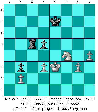 Last move : 1/2-1/2 2011 May 19 13:26:16 [Event "FICGS__CHESS__RAPID_SM__000008"] [Site "FICGS"] [Date "2011.05.01"] [Round "1"] [White "Nichols,Scott"] [Black "Pessoa,Francisco"] [Result "1/2-1/2"] [WhiteElo "2232"] [BlackElo "2528"] 1.e4 e6 2.d4 d5 3.Nc3 Nf6 4.e5 Nfd7 5.f4 c5 6.Nf3 Nc6 7.Be3 Be7 8.Qd2 O-O 9.Be2 b6 10.O-O Bb7 11.Rad1 Rc8 12.f5 cxd4 13.Nxd4 Nxd4 14.Bxd4 exf5 15.Rxf5 Nc5 16.Bg4 Ne6 17.Rxf7 Kxf7 18.Rf1+ Ke8 19.Bxe6 Rxf1+ 20.Kxf1 Rc6 21.Bg8 Qd7 22.Qf4 Kd8 23.e6 Qd6 24.Qxd6+ Rxd6 25.Ne2 Rc6 26.Bxg7 Ba6 27.Bxh7 Rxe6 28.Bd3 Bxd3 29.cxd3 Rc6 30.g3 Ke8 31.h4 b5 32.a3 a5 33.Bc3 b4 34.axb4 axb4 35.Bd4 Rc2 36.Kf2 b3 37.Kf3 Bf8 38.Nf4 Bc5 39.Bxc5 Rxc5 40.Ke3 Ke7 1/2-1/2 Thibault de Vassal Quite spectacular game :) French : Steinitz, Boleslavsky variation Kingside Castling by player Black (move 8) Kingside Castling by player White (move 10) 10 pieces endgame at move 39 : White KNPPPP , Black KRPP WHITE : King + 1 Knight 4 Pawns BLACK : King + 1 Rook 2 Pawns This chess game ended in a draw. Follow this game move after move (download)The way he plays Chess demonstrates a man's whole nature. (Stanley Ellin) Konzentriere dich auf materielle Gewinne. Nimm, was dir dein Gegner gibt, ausser es gibt einen guten Grund der dagegenspricht. (Robert James Fischer) En manos de Fischer's, una diminuta ventaja teórica es tan buena como tener una Reina de ventaja. (Isaac Kashdan) Comme les marins qui ont mille raisons différentes d'aller en mer, les joueurs d'échecs en ont tout autant avant de s'installer devant une table et jouer... (Vincent Bertignac, philosophe) I teach you to lie, cheat and steal, and as soon as my back's turned you wait in line ? (Gregory House, House M.D.)