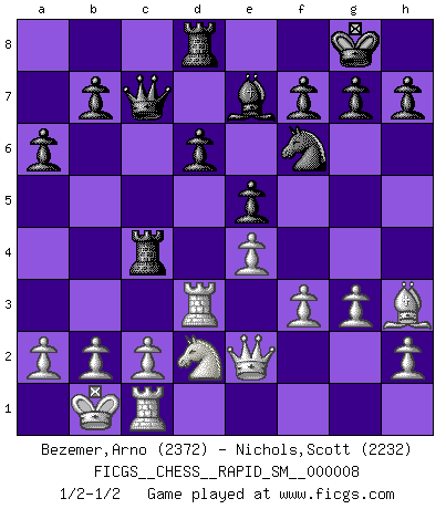 Last move : 1/2-1/2 2011 May 13 16:39:59 [Event "FICGS__CHESS__RAPID_SM__000008"] [Site "FICGS"] [Date "2011.05.01"] [Round "1"] [White "Bezemer,Arno"] [Black "Nichols,Scott"] [Result "1/2-1/2"] [WhiteElo "2372"] [BlackElo "2232"] 1.e4 c5 2.Nf3 d6 3.d4 cxd4 4.Nxd4 Nf6 5.Nc3 a6 6.Be3 e5 7.Nb3 Be6 8.Qd2 Be7 9.O-O-O Ng4 10.Kb1 Nd7 11.g3 Nxe3 12.Qxe3 Qb6 13.Qe2 Rc8 14.Nd5 Bxd5 15.Rxd5 Nf6 16.Rd3 O-O 17.Bh3 Rc4 18.f3 Qc7 19.Rc1 Rd8 20.Nd2 1/2-1/2 Sicilian : Najdorf, Byrne (English) attack Queenside Castling by player White (move 9) Kingside Castling by player Black (move 16) This chess game ended in a draw. Follow this game move after move (download)I had a toothache during the first game. In the second game I had a headache. In the third game it was an attack of rheumatism. In the fourth game, I wasn't feeling well. And in the fifth game? Well, must one have to win every game ? (Siegbert Tarrasch) Du weisst es gibt ein Problem mit Computern und Fernschach, wenn jeder eine Rating von 2450 hat. (John Christen Knudsen) El Ajedrez no es como la vida... ¡tiene reglas!. (Mark Pasternak) Des combinaisons [dans le jeu d'échecs] pareilles à des mélodies. Je crois entendre pour ainsi dire la musique des coups... (Vladimir Nabokov) It's not enough to succeed. Others must fail. (Gore Vidal)