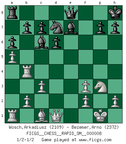 Last move : 1/2-1/2 2011 July 7 20:57:32 [Event "FICGS__CHESS__RAPID_SM__000008"] [Site "FICGS"] [Date "2011.05.01"] [Round "1"] [White "Wosch,Arkadiusz"] [Black "Bezemer,Arno"] [Result "1/2-1/2"] [WhiteElo "2109"] [BlackElo "2372"] 1.e4 e5 2.Nf3 Nc6 3.Bc4 Nf6 4.d3 Be7 5.O-O O-O 6.Re1 d6 7.a4 Kh8 8.a5 a6 9.c3 Ng8 10.d4 f5 11.dxe5 fxe4 12.Rxe4 Rxf3 13.gxf3 Nxe5 14.Na3 Nxc4 15.Nxc4 Bd7 16.Ne3 Nf6 17.Rb4 Bc6 18.Nf5 Qe8 19.Ng3 Nd7 1/2-1/2 Two knights defense (Modern Bishop's Opening) Kingside Castling by player White (move 5) Kingside Castling by player Black (move 5) This chess game ended in a draw. Follow this game move after move (download)All I want to do, ever, is just play Chess. (Bobby Fischer) Capablanka war das größte Genie der Schachgeschichte! Aber denken sie nicht er habe nichts vom Schach verstanden. Er wusste nur soviel wie er wissen musste um seine Ziele zu erreichen. (Mikhail Moiseyevich Botvinik) Yo he agregado estos principios a la ley: pongan los Caballos en acción antes de que los dos Alfiles sean desarrollados. (Emanuel Lasker) Roi des jeux et jeu des rois, les échecs portent en eux un sentiment d'infini. Ils donnent à celui qui s'est efforcé d'en approfondir les arcanes l'impression de n'être pas à la mesure de l'homme; en fait, ils constituent un résumé de l'univers, un microcosme, et figurent cette grande échelle qui, dans les plans de la lumière descend jusqu'à la matière, qui des abîmes insondables remonte jusqu'en l'infini de Dieu. (Pyrame) If you are going through hell, keep going. (Winston Churchill)