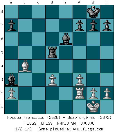 Last move : 1/2-1/2 2011 May 31 10:51:35 [Event "FICGS__CHESS__RAPID_SM__000008"] [Site "FICGS"] [Date "2011.05.01"] [Round "1"] [White "Pessoa,Francisco"] [Black "Bezemer,Arno"] [Result "1/2-1/2"] [WhiteElo "2528"] [BlackElo "2372"] 1.e4 e5 2.Nf3 Nc6 3.Bc4 Nf6 4.Ng5 d5 5.exd5 Na5 6.Bb5+ c6 7.dxc6 bxc6 8.Qf3 Be7 9.Bxc6+ Nxc6 10.Qxc6+ Bd7 11.Qf3 O-O 12.d3 Ng4 13.Nh3 Rc8 14.Nc3 Rc6 15.Qe2 Rg6 16.Bd2 Qb8 17.O-O Qb7 18.f3 Ne3 19.Qxe3 Bxh3 20.Rf2 Qxb2 21.Rb1 Qxc2 22.Rc1 Qb2 23.Nd5 Ba3 24.Re1 Rd8 25.Qxe5 Qxe5 26.Rxe5 Re6 27.Rxe6 Bxe6 28.Bb4 Rxd5 1/2-1/2 Two knights defense Kingside Castling by player Black (move 11) Kingside Castling by player White (move 17) This chess game ended in a draw. Follow this game move after move (download)Life is like a game of Chess, changing with each move. (Chinese proverb) Wenn ich Weiß habe gewinne ich weil ich Weiß habe, wenn ich Schwarz habe gewinne ich weil ich Bogoljubov bin. (Efim Bogoljubov) Creo que una cierta cantidad de temperamento es esperada de los genios del Ajedrez. (Ron Gross) Des idées, des idées, j'en ai cent, j'en ai mille. Des bonnes, des mauvaises, applicables, irréalisables... Il suffit de faire le tri ! (Roos) Empty your mind, be formless, shapeless — like water. (Bruce Lee)