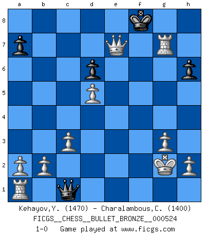 Last move : 1-0 2011 May 1 15:4:58 [Event "FICGS__CHESS__BULLET_BRONZE__000524"] [Site "FICGS"] [Date "2011.05.01"] [Round "1"] [White "Kehayov,Yulian"] [Black "Charalambous,Charles"] [Result "1-0"] [WhiteElo "1470"] [BlackElo "1400"] 1.Nc3 c5 2.Nf3 Nc6 3.e4 e5 4.Bc4 d6 5.Nd5 h6 6.O-O Nf6 7.d3 Be6 8.Nh4 Nd4 9.c3 Nxd5 10.exd5 Bd7 11.g3 Nf5 12.Nxf5 Bxf5 13.f4 Be7 14.fxe5 Bh3 15.Bb5+ Bd7 16.Bxd7+ Qxd7 17.Rxf7 c4 18.e6 Qb5 19.Qh5 O-O-O 20.Rxe7 cxd3 21.Rxg7 Rhf8 22.e7 Rf1+ 23.Kxf1 d2 24.Kg2 Qe2+ 25.Qxe2 dxc1Q 26.exd8Q+ Kxd8 27.Qe7+ Kc8 28.Qxb7+ Kd8 29.Qc7+ Ke8 30.Qd7+ Kf8 31.Qe7+ 1-0 Dunst (Sleipner, Heinrichsen) Opening Kingside Castling by player White (move 6) Queenside Castling by player Black (move 19) Promotion Queen by player Black (move 25) Promotion Queen by player White (move 26) Player White won this chess game. Follow this game move after move (download)Chess, like any creative activity, can exist only through the combined efforts of those who have creative talent, and those who have the ability to organize their creative work. (Mikhail Botvinnik) Frage des Reporters: -Worin besteht das Ziel von Gambiteröffnungen? Antwort: -Auf Kosten der Partie einen Ruf als Angriffspieler zu erwerben.- (Siegbert Tarrasch) Cuando tengo las piezas blancas, yo gano porque soy blanco; Cuando tengo las piezas negras, yo gano porque soy Bogolyubov. (Bogolyubov) Karpov est une pièce de musée. (Garry Kasparov) It is the aim of the modern school, not to treat every position according to one general law, but according to the principle inherent in the position. (Richard Reti)
