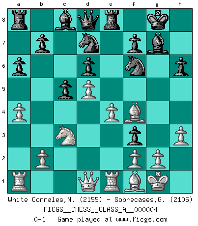 Last move : 0-1 2006 June 10 1:59:24 [Event "FICGS__CHESS__CLASS_A__000004"] [Site "FICGS"] [Date "2006.05.04"] [Round "1"] [White "White Corrales,Nicolas"] [Black "Sobrecases,Guy"] [Result "0-1"] [WhiteElo "2155"] [BlackElo "2105"] 1.d4 Nf6 2.Nf3 e6 3.c4 c5 4.d5 exd5 5.cxd5 d6 6.Nc3 h6 7.e4 Nbd7 8.Be2 g5 9.O-O Bg7 10.h3 O-O 11.Re1 Re8 12.Bf1 a6 13.a4 g4 14.Bf4 gxf3 0-1 Queen's pawn game Kingside Castling by player White (move 9) Kingside Castling by player Black (move 10) Player Black won this chess game. Follow this game move after move (download)The isolated Pawn casts gloom over the entire chessboard. (Aaron Nimzovich) Der Verteidiger gebe der Gewalt nach, aber nur der Gewalt. Er schaffe sich nicht freiwillig, etwa aus Blindheit oder aus Schrecken, irgendwelche Schwächen. Er lasse sich nicht bluffen. (Emanuel Lasker) Fischer era un maestro de claridad y un Rey del posicionamiento astuto. Sus oponentes podían ver hacia donde se dirigía pero eran impotentes para detenerlo. (Bruce Pandolfini) Horreur, mais aussi harmonie suprême : qu'y avait-il en effet au monde en dehors des échecs ? Le brouillard, l'inconnu, le non-être... (Vladimir Nabokov) The human is the only animal species whose members are able to talk themselves into difficulties that would not otherwise exist. (Wendell Johnson)