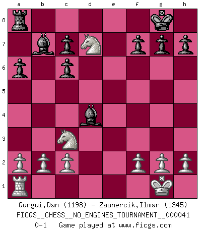 Last move : 0-1 2011 July 25 20:44:56 [Event "FICGS__CHESS__NO_ENGINES_TOURNAMENT__000041"] [Site "FICGS"] [Date "2011.05.02"] [Round "1"] [White "Gurgui,Dan"] [Black "Zaunercik,Ilmar"] [Result "0-1"] [WhiteElo "1198"] [BlackElo "1345"] 1.e4 e5 2.Nf3 Nc6 3.Bb5 a6 4.Bxc6 bxc6 5.O-O d6 6.d4 exd4 7.Qxd4 Nf6 8.Bg5 Be7 9.Rd1 O-O 10.Bxf6 Bxf6 11.e5 dxe5 12.Qxd8 Rxd8 13.Rxd8+ Bxd8 14.Nxe5 Bb7 15.Nc3 Bf6 16.Nd7 Bd4 0-1 Ruy Lopez : Exchange variation Kingside Castling by player White (move 5) Kingside Castling by player Black (move 9) Player Black won this chess game. Follow this game move after move (download)Do you realize Fischer almost never has any bad pieces? He exchanges them, and the bad pieces remain with his opponents. (Yuri Balashov) Das Schach ist nichts für kleine Geister, es beansprucht einen vollen Mann, der sich nicht sklavisch an das Überlieferte hält, sondern selbständig die Tiefen des Spiels zu ergründen sucht. (Wilhelm Steinitz) Nunca antes ha habido un jugador de Ajedrez con tal conocimiento a fondo de las complejidades del juego y una inmensa voluntad absolutamente indomable de ganar. Yo pienso que Fischer es el jugador mas grande que jamás haya existido. (Lisa Lane) Même un GMI sait rarement calculer sur plus de cinq coups une attaque à sacrifices. (Rudolf Spielmann) Fear is the path to the dark side. Fear leads to anger; anger leads to hate; hate leads to suffering. I sense much fear in you. (Master Yoda in Star Wars ep.1)