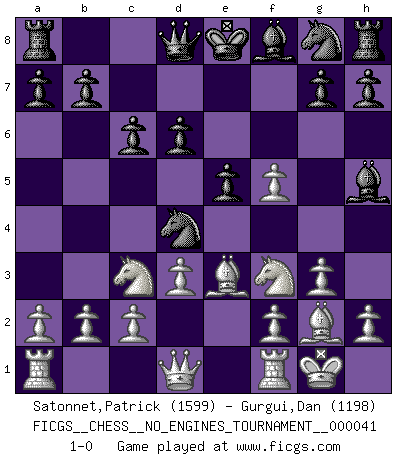 Last move : 1-0 2011 June 23 20:4:15 [Event "FICGS__CHESS__NO_ENGINES_TOURNAMENT__000041"] [Site "FICGS"] [Date "2011.05.02"] [Round "1"] [White "Satonnet,Patrick"] [Black "Gurgui,Dan"] [Result "1-0"] [WhiteElo "1599"] [BlackElo "1198"] 1.e4 e5 2.Nf3 d6 3.g3 Bg4 4.Bg2 Nc6 5.O-O Bh5 6.Nc3 Nd4 7.d3 c6 8.Be3 f5 9.exf5 1-0 This chess game has been lost on time (started : 2011.05.02 10:24:20) Philidor's defense Kingside Castling by player White (move 5) Player White won this chess game. Follow this game move after move (download)Chess is a fighting game which is purely intellectual and includes chance. (Richard Reti) Alles was ich jemals tun will ist Schach spielen. (Robert James Fischer) De todos mis libros Rusos, la defensa contiene y difunde el 'calor' mas grande que pudiese verse extraño al observar lo supremamente abstracto que el Ajedrez supuestamente es. (Vladimir Nabokov) Psychologiquement, tu dois avoir confiance en toi même, mais cette confiance doit être basée sur des faits. (Robert Fischer) Kids, you tried your best and you failed miserably. The lesson is, never try. (Simpsons)