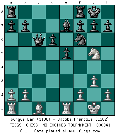 Last move : 0-1 2011 July 19 20:33:56 [Event "FICGS__CHESS__NO_ENGINES_TOURNAMENT__000041"] [Site "FICGS"] [Date "2011.05.02"] [Round "1"] [White "Gurgui,Dan"] [Black "Jacobs,Francois"] [Result "0-1"] [WhiteElo "1198"] [BlackElo "1502"] 1.e4 c5 2.Nf3 d6 3.d4 cxd4 4.Qxd4 Nc6 5.Bb5 Bd7 6.Bxc6 Bxc6 7.O-O Nf6 8.Rd1 Bxe4 9.Nfd2 Bxc2 10.Re1 Qc7 11.Na3 e5 12.Qc3 Qxc3 13.Nxc2 Qxc2 14.Nf3 Be7 15.g3 Qc6 16.Ng5 O-O 0-1 Sicilian, Chekhover variation Kingside Castling by player White (move 7) Kingside Castling by player Black (move 16) Player Black won this chess game. Follow this game move after move (download)We don't really know how the game was invented, though there are suspicions. As soon as we discover the culprits, we'll let you know. (Bruce Pandolfini) Die jungen Leute sollen verstehen, dass sie noch etwas von mir lernen können und müssen. (Viktor Kortschnoi) Mis oponentes también hacen buenas movidas. A veces yo no tomo esas cosas en consideración. (Bobby Fischer) Botvinnik disait en comparant les échecs à la musique: Il existe une science dont le but est l'étude de l'acoustique et des sons. Mais il y a aussi un art qui se sert de l'océan des sons : c'est la musique. De toute évidence, il en est de même pour la pensée. La logique est l'étude des lois de la réflexion et les échecs reflètent, en tant qu'art, le côté logique de la réflexion, sous la forme d'images artistiques... Extrait de Fischer - Spassky, Reykjavik 1972 par Alexander & F. Wyndham (Ed. Solar), p 37. It's not the will to win, but the will to prepare to win that makes the difference. (Bear Bryant)